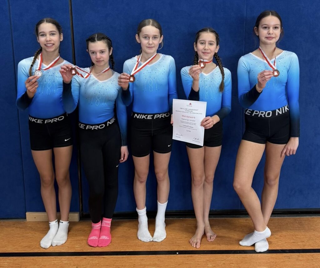 Am 20.2.26 standen dann die Hamburger Meisterschaften im Sportzentrum Steinhauerdamm an und die Turnwettkämpfe sind schon immer etwas Besonderes, wenn die Turnierinnen der teilnehmenden Schulen in glitzernden Anzügen zur Musik und mit der Unterstützung der klatschenden Zuschauer in die Halle einmarschieren. Im Wettkampf selbst sind die Turnerinnen völlig auf ihr eigenes Tun fokussiert. Vieles gelang gut, aber es gab auch kleine Patzer, die aber einfach dazugehören und passieren können. Besonders punkteten die Mädchen in diesem Jahr bei den verschiedenen Synchronaufgaben und haben dort als Team ganz toll zusammengearbeitet.